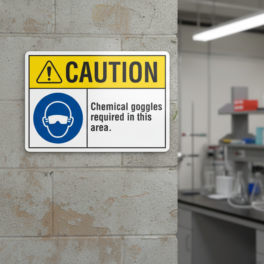 The Caution Chemical goggles required in this area. is designed to provide exceptional performance and longevity in a variety of environments. this sign component ensures strength and weather resistance, making it ideal for both indoor and outdoor applications. With a size specification of 10X7, 14X10, 5X3.5, 7X5, it fits standard installation requirements while offering versatility for different mounting setups. Whether you’re updating an existing setup or building new signage, this item ensures a reliable, high-quality finish that represents your brand or message clearly and professionally.