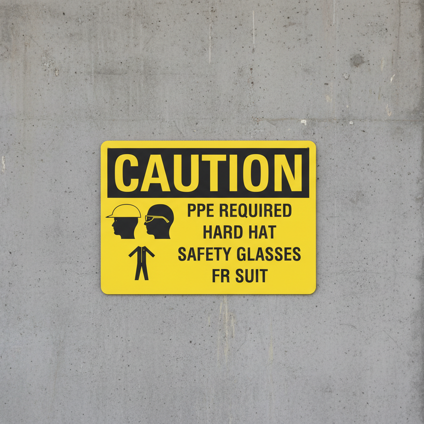 Caution PPE required hard hat safety glasses FR suit