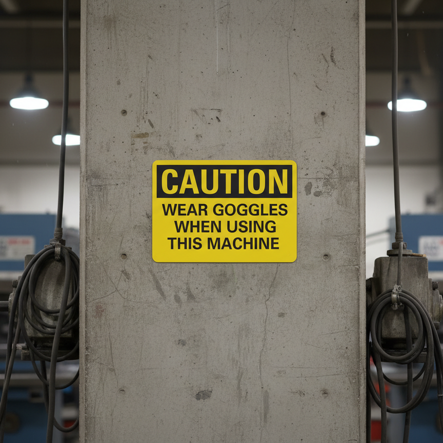The Caution Wear goggles when using this machine is designed to provide exceptional performance and longevity in a variety of environments. this sign component ensures strength and weather resistance, making it ideal for both indoor and outdoor applications. With a size specification of 10X7, it fits standard installation requirements while offering versatility for different mounting setups. Whether you’re updating an existing setup or building new signage, this item ensures a reliable, high-quality finish that represents your brand or message clearly and professionally.