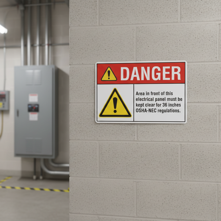 The Danger Area in front of this electrical panel must be is designed to provide exceptional performance and longevity in a variety of environments. this sign component ensures strength and weather resistance, making it ideal for both indoor and outdoor applications. With a size specification of 10X7, 14X10, 5X3.5, 7X5, it fits standard installation requirements while offering versatility for different mounting setups. Whether you’re updating an existing setup or building new signage, this item ensures a reliable, high-quality finish that represents your brand or message clearly and professionally.