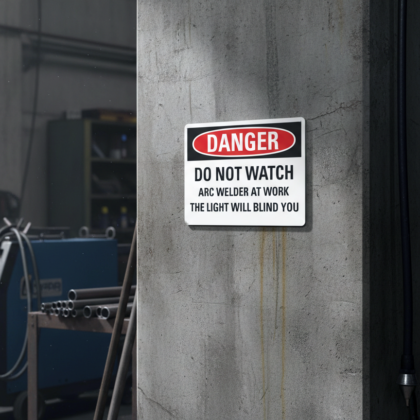 The Danger Do not watch arc welder at work the light will is designed to provide exceptional performance and longevity in a variety of environments. this sign component ensures strength and weather resistance, making it ideal for both indoor and outdoor applications. With a size specification of 10X7, 14X10, 5X3.5, 7X5, it fits standard installation requirements while offering versatility for different mounting setups. Whether you’re updating an existing setup or building new signage, this item ensures a reliable, high-quality finish that represents your brand or message clearly and professionally.