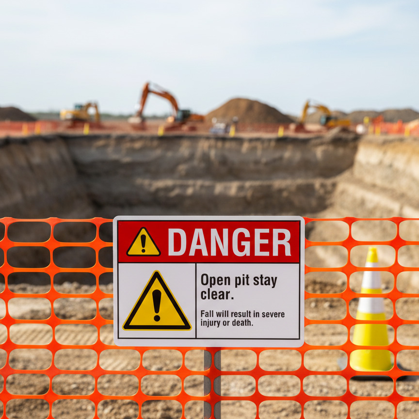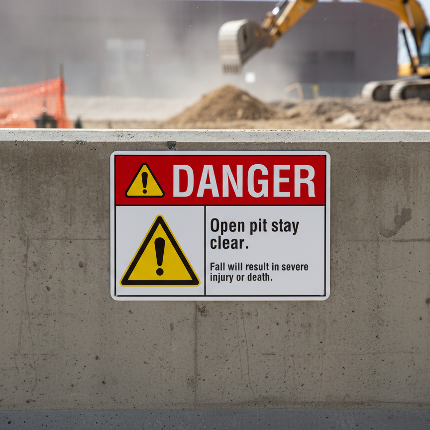 Danger Open pit. Stay clear. Fall will result in severe