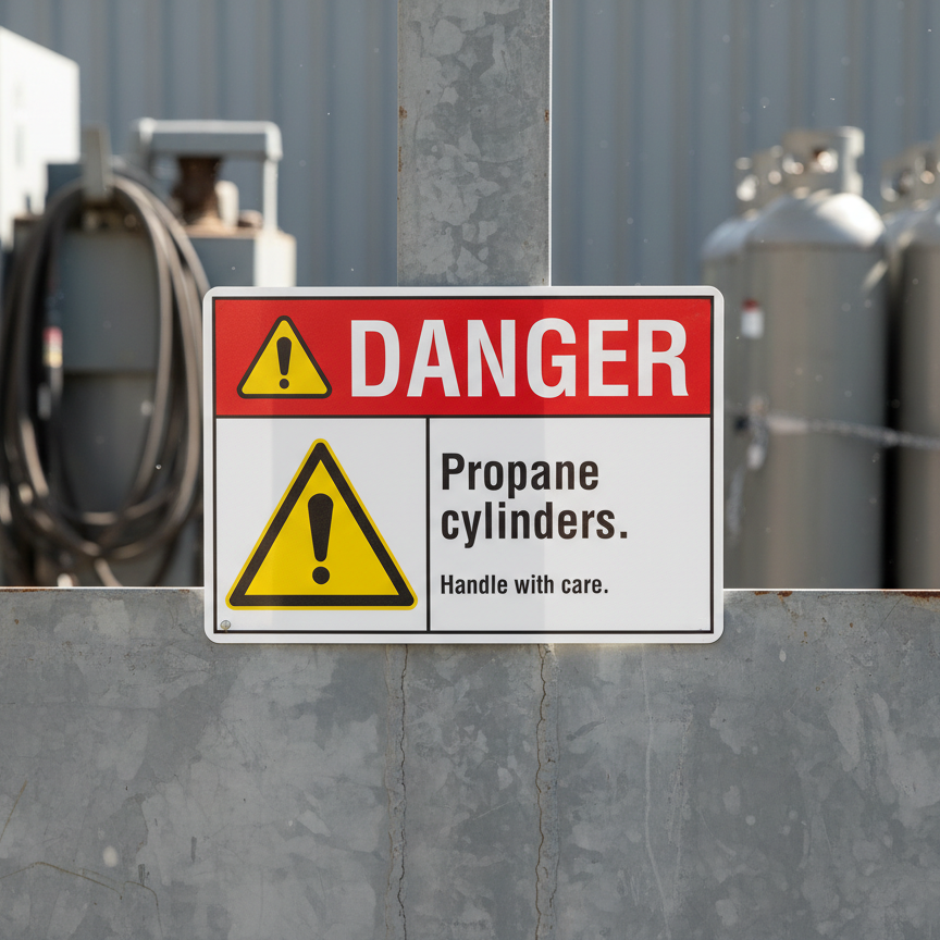 The Danger Propane cylinders. Handle with care. is designed to provide exceptional performance and longevity in a variety of environments. this sign component ensures strength and weather resistance, making it ideal for both indoor and outdoor applications. With a size specification of 10X7, 14X10, 5X3.5, 7X5, it fits standard installation requirements while offering versatility for different mounting setups. Whether you’re updating an existing setup or building new signage, this item ensures a reliable, high-quality finish that represents your brand or message clearly and professionally.