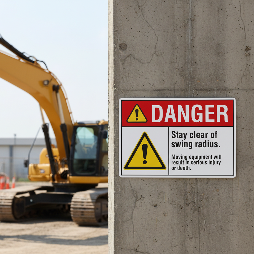 The Danger Stay clear of swing radius. Moving equipment is designed to provide exceptional performance and longevity in a variety of environments. this sign component ensures strength and weather resistance, making it ideal for both indoor and outdoor applications. With a size specification of 10X7, 14X10, 5X3.5, 7X5, it fits standard installation requirements while offering versatility for different mounting setups. Whether you’re updating an existing setup or building new signage, this item ensures a reliable, high-quality finish that represents your brand or message clearly and professionally.