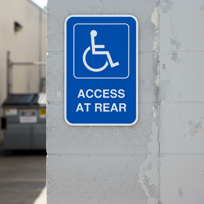 The (Handicap Sym) Access At Rear is designed to provide exceptional performance and longevity in a variety of environments. this sign component ensures strength and weather resistance, making it ideal for both indoor and outdoor applications. With a size specification of 12X18, it fits standard installation requirements while offering versatility for different mounting setups. Whether you’re updating an existing setup or building new signage, this item ensures a reliable, high-quality finish that represents your brand or message clearly and professionally.