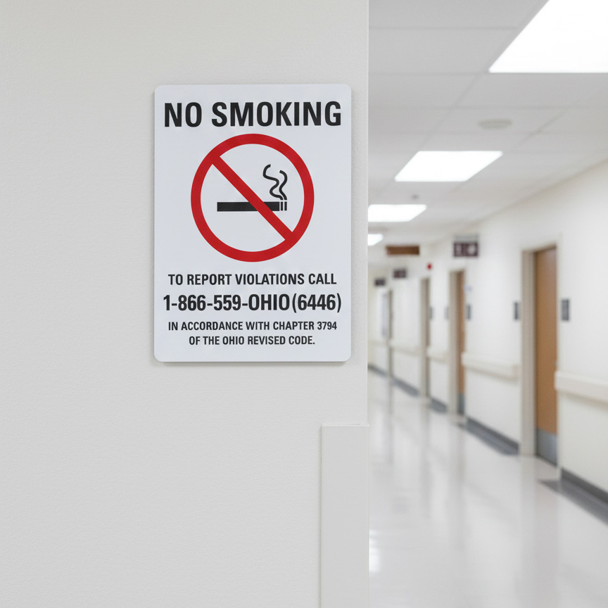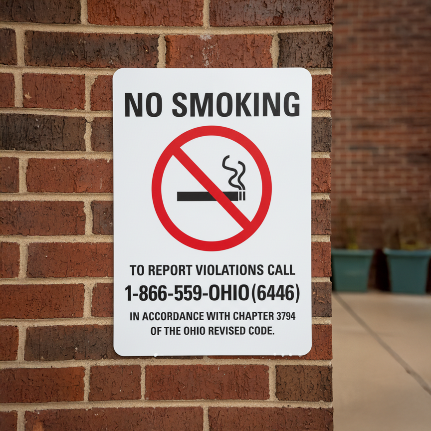 The No Smoking (Sym) To Report Violations Call 1-866-559-OHIO is designed to provide exceptional performance and longevity in a variety of environments. this sign component ensures strength and weather resistance, making it ideal for both indoor and outdoor applications. With a size specification of 7X10, 10X14, it fits standard installation requirements while offering versatility for different mounting setups. Whether you’re updating an existing setup or building new signage, this item ensures a reliable, high-quality finish that represents your brand or message clearly and professionally.