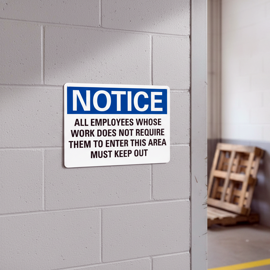 The Notice All Employees Whose Work Does Not Require is designed to provide exceptional performance and longevity in a variety of environments. this sign component ensures strength and weather resistance, making it ideal for both indoor and outdoor applications. With a size specification of 10X7, 14X10, 7X5, it fits standard installation requirements while offering versatility for different mounting setups. Whether you’re updating an existing setup or building new signage, this item ensures a reliable, high-quality finish that represents your brand or message clearly and professionally.