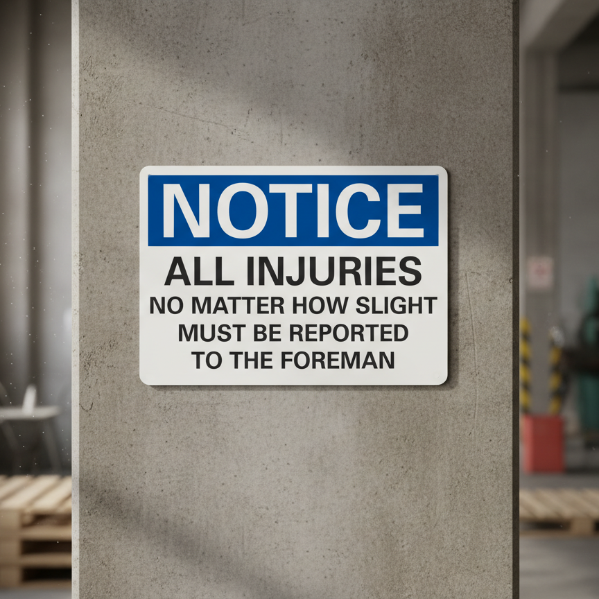 The Notice All injuries no matter how slight they may seem is designed to provide exceptional performance and longevity in a variety of environments. this sign component ensures strength and weather resistance, making it ideal for both indoor and outdoor applications. With a size specification of 14X10, 10X7, 5X3.5, 7X5, it fits standard installation requirements while offering versatility for different mounting setups. Whether you’re updating an existing setup or building new signage, this item ensures a reliable, high-quality finish that represents your brand or message clearly and professionally.