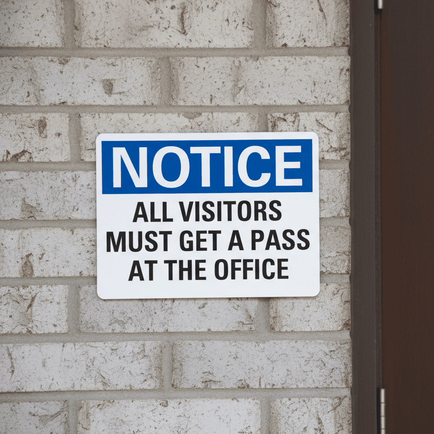 The Notice All Visitors Must Get A Pass At Office is designed to provide exceptional performance and longevity in a variety of environments. this sign component ensures strength and weather resistance, making it ideal for both indoor and outdoor applications. With a size specification of 14X10, it fits standard installation requirements while offering versatility for different mounting setups. Whether you’re updating an existing setup or building new signage, this item ensures a reliable, high-quality finish that represents your brand or message clearly and professionally.