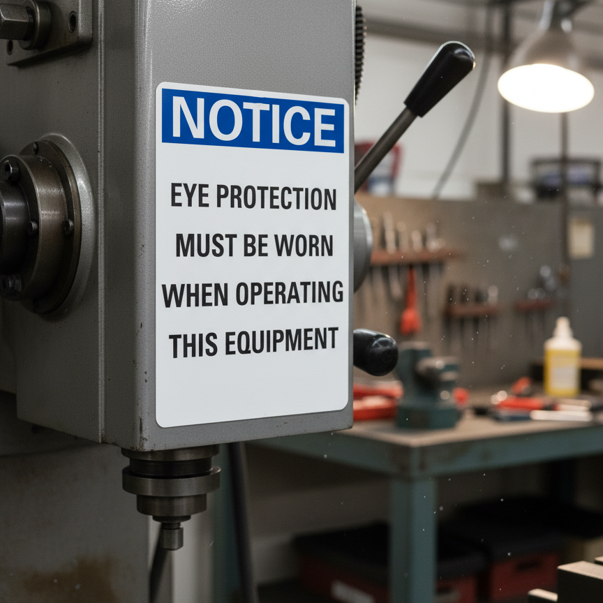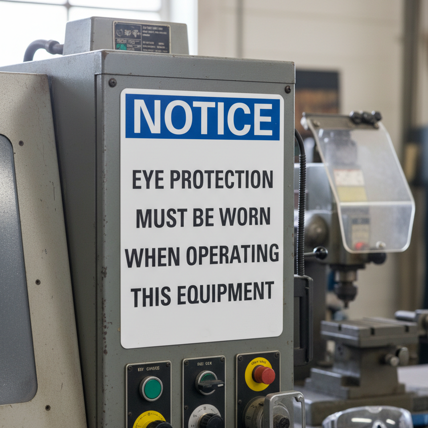 The Notice Eye protection must be worn when operating this is designed to provide exceptional performance and longevity in a variety of environments. this sign component ensures strength and weather resistance, making it ideal for both indoor and outdoor applications. With a size specification of 10X7, 5X3.5, it fits standard installation requirements while offering versatility for different mounting setups. Whether you’re updating an existing setup or building new signage, this item ensures a reliable, high-quality finish that represents your brand or message clearly and professionally.