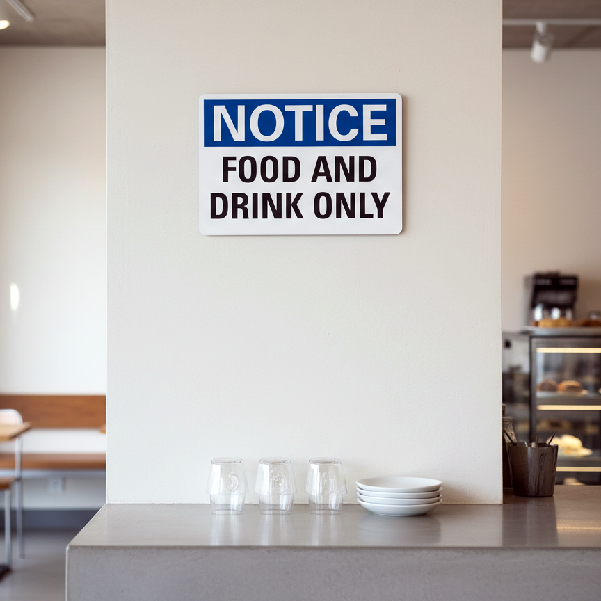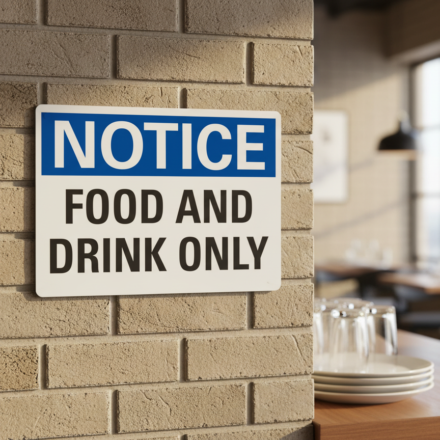 The Notice Food And Drink Only is designed to provide exceptional performance and longevity in a variety of environments. this sign component ensures strength and weather resistance, making it ideal for both indoor and outdoor applications. With a size specification of 10X7, 14X10, 7X5, it fits standard installation requirements while offering versatility for different mounting setups. Whether you’re updating an existing setup or building new signage, this item ensures a reliable, high-quality finish that represents your brand or message clearly and professionally.