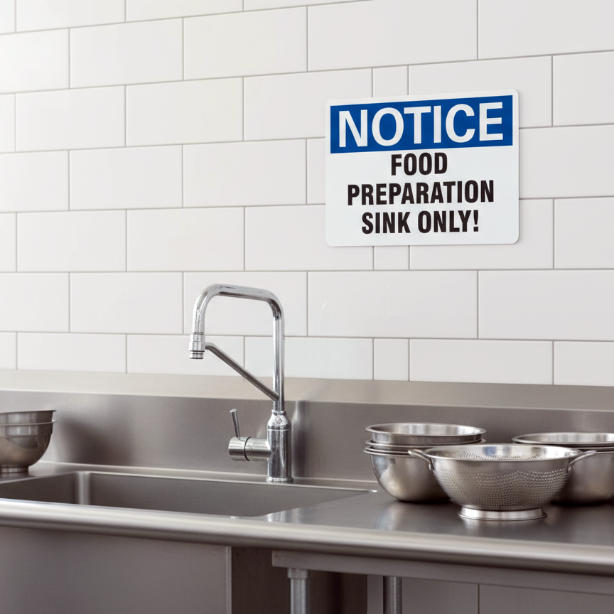 The Notice Food Preparation Sink Only! is designed to provide exceptional performance and longevity in a variety of environments. this sign component ensures strength and weather resistance, making it ideal for both indoor and outdoor applications. With a size specification of 14X10, 10X7, 7X5, it fits standard installation requirements while offering versatility for different mounting setups. Whether you’re updating an existing setup or building new signage, this item ensures a reliable, high-quality finish that represents your brand or message clearly and professionally.
