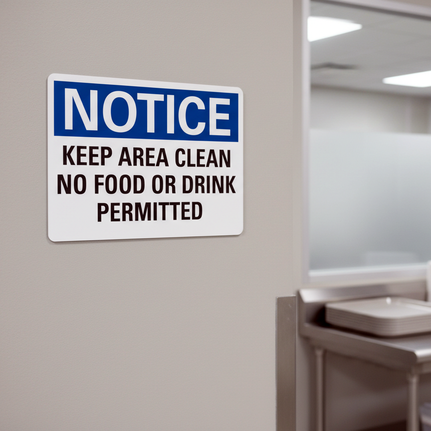 The Notice Keep Area Clean No Food Or Drink Permitted is designed to provide exceptional performance and longevity in a variety of environments. this sign component ensures strength and weather resistance, making it ideal for both indoor and outdoor applications. With a size specification of 10X7, 14X10, 7X5, it fits standard installation requirements while offering versatility for different mounting setups. Whether you’re updating an existing setup or building new signage, this item ensures a reliable, high-quality finish that represents your brand or message clearly and professionally.