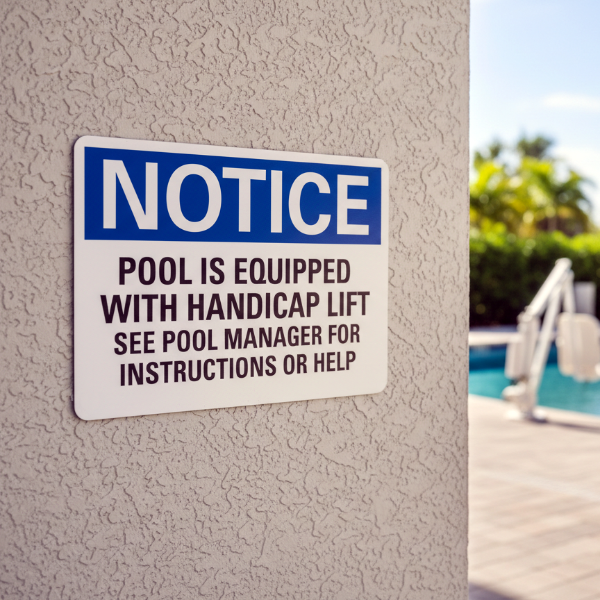 The Notice Pool Is Equipped With Handicap Lift See is designed to provide exceptional performance and longevity in a variety of environments. this sign component ensures strength and weather resistance, making it ideal for both indoor and outdoor applications. With a size specification of 10X7, it fits standard installation requirements while offering versatility for different mounting setups. Whether you’re updating an existing setup or building new signage, this item ensures a reliable, high-quality finish that represents your brand or message clearly and professionally.